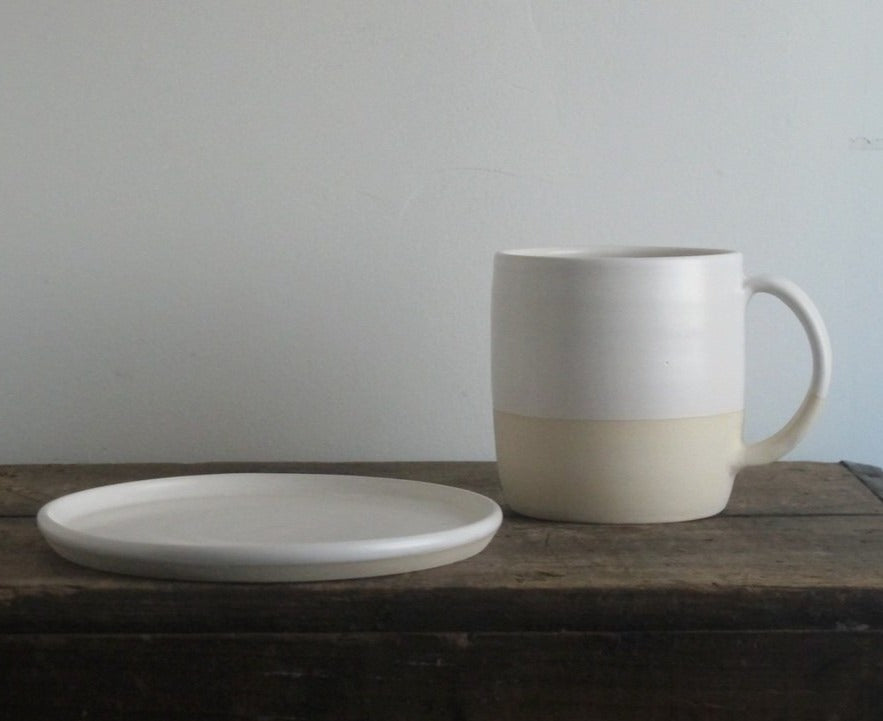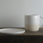 Unglazed clay banded with a matte-finish glaze provides a pleasing study in contrasts of texture and color.  These sturdy mugs are both contemporary and rustic, the perfect size to wrap your hands around for a cozy cup of tea or hot chocolate on a crisp morning. Thrown on a wheel by Vermont-based potter Natania Hume, each individual mug has its own character and will have subtle variations in form, color and size, reflecting the handmade nature of the line.