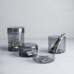 The smoke finish is a modern and sleek dark grey glass. The contents are still visible but muted when seen through the smoky grey glass,  particularly useful for obscuring distracting packaging and the like while still permitting easy identification and tracking the amount left.