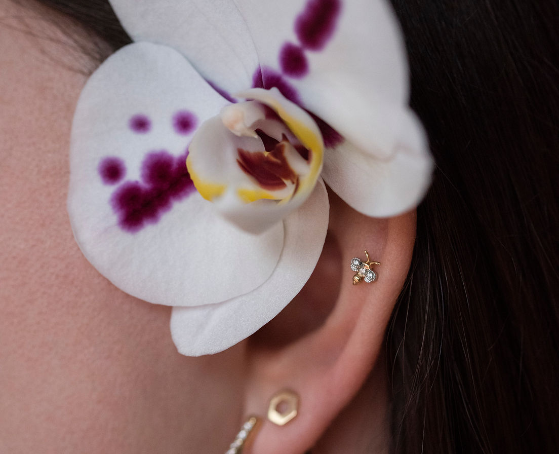 These sweet studs are part of the Beekeeper Collection, inspired by the vital pollinator and the sacred geometry of their hives. ​Bees are vital to the food supply yet their populations are in decline and endangered. Arte Vitta donates a portion of sales from this collection to The Bee Conservancy, which works to protect bee species and safeguard their environment.