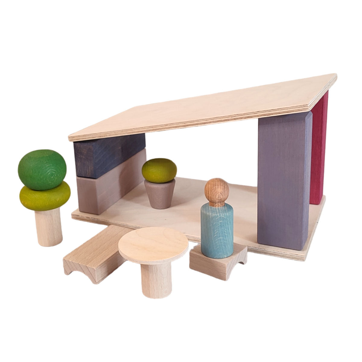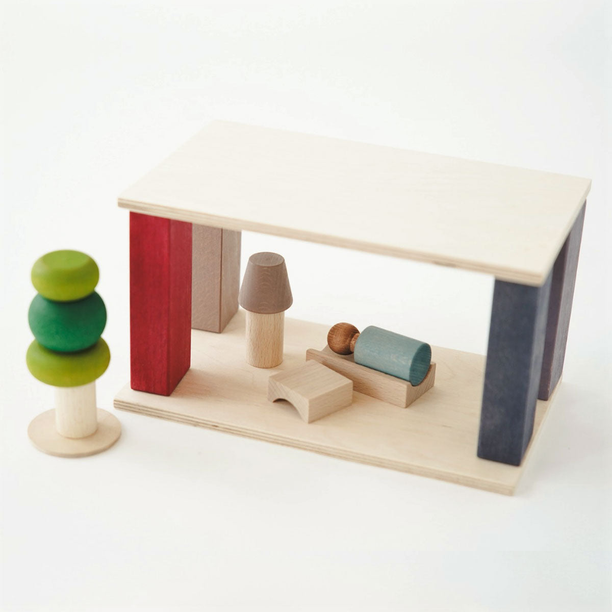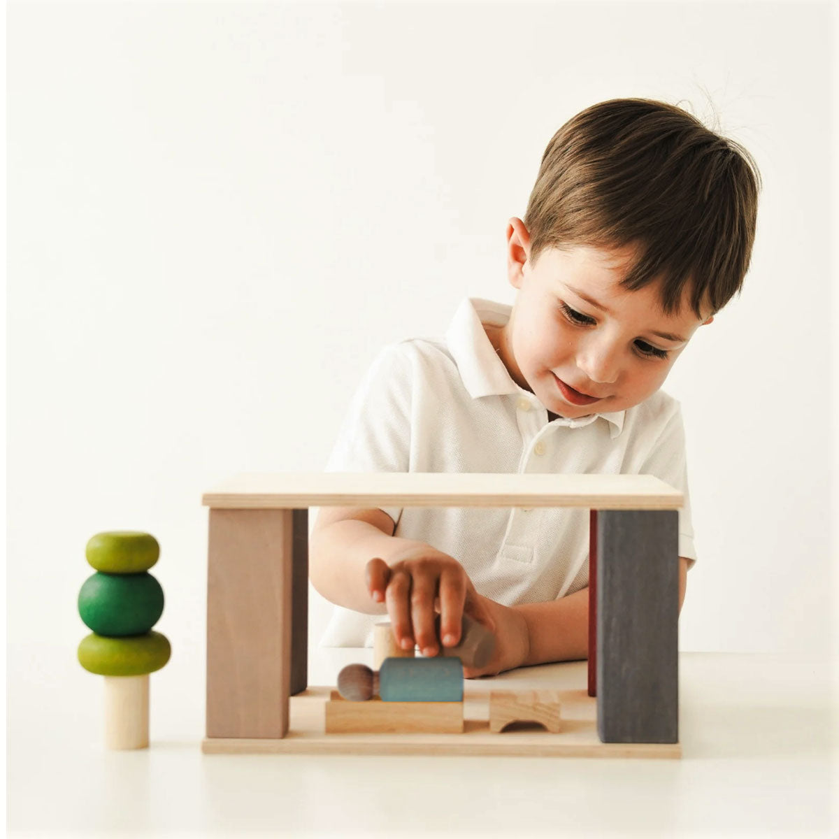 Build your own house with the My Cabin wooden toy set. Designed to be open-ended and minimal to encourage imaginative play, the set includes a hand-painted peg doll, four colored beech wood blocks, two quality birch plywood sheets and nine wooden pieces that can be used as furniture, plants or whatever comes to mind.