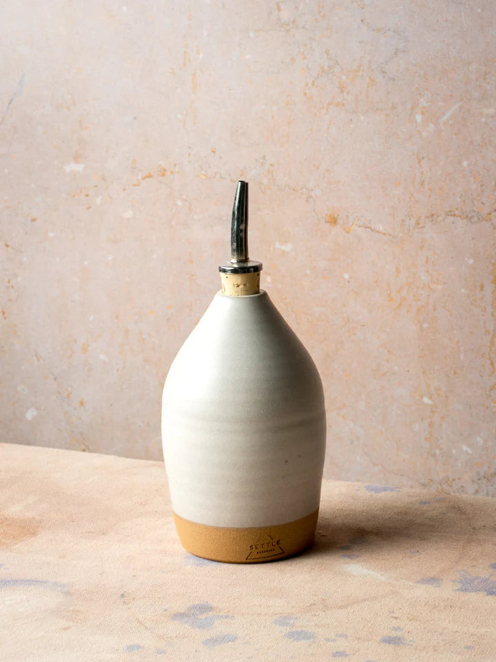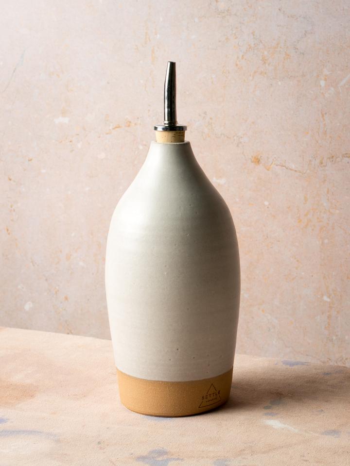 Lovely simple ceramic oil dispenser with pour spout. Helps with a more precise pour while also protecting oil from the light, and keeps the cacophony of labels to a minimum in your kitchen.