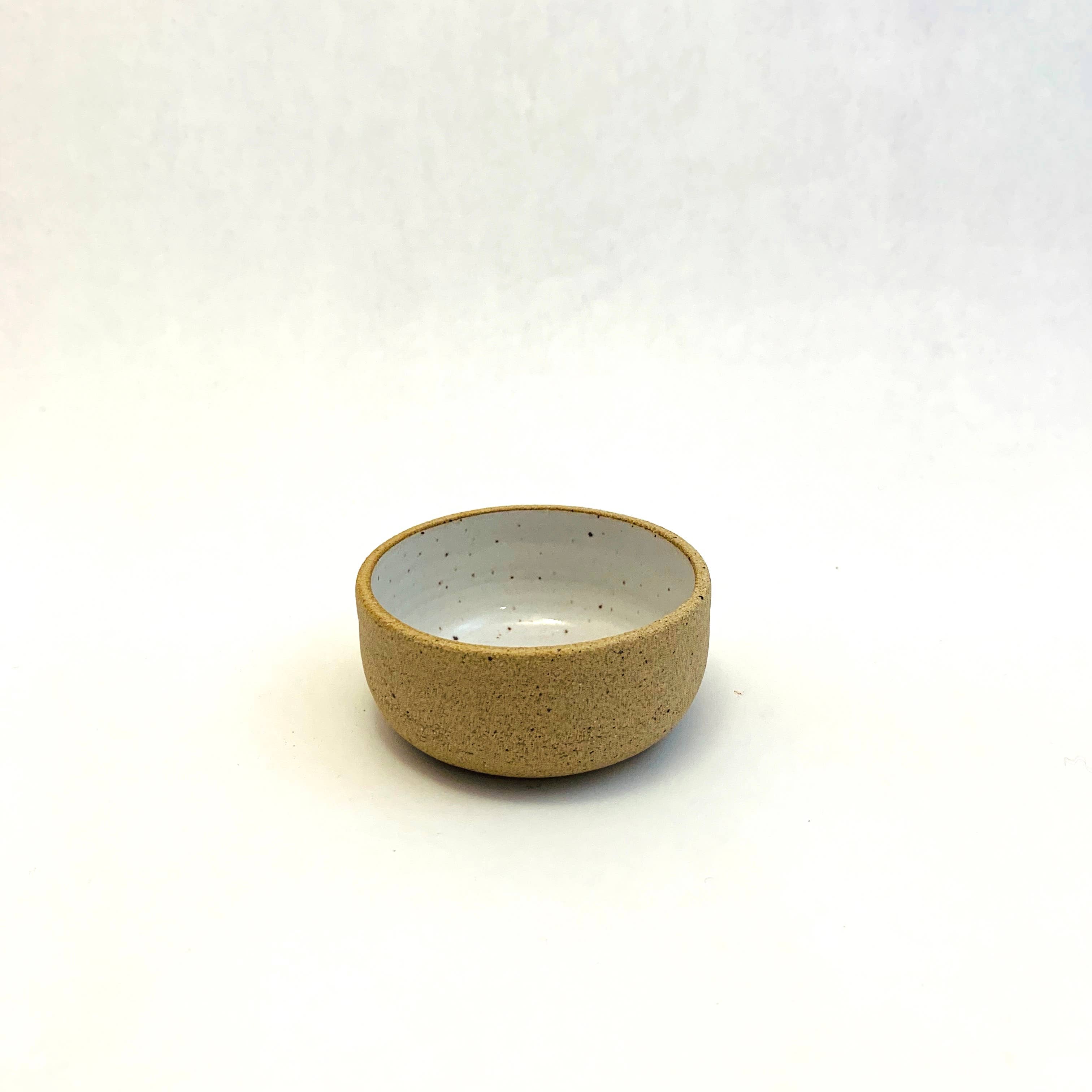 Perfectly sized for keeping salt on the table, serving olives and nuts, or for mise en place in the kitchen. This sturdy little bowl is reassuringly solid feeling and ready to be at your service. Handmade on a pottery wheel, natural exterior and glazed interior.
