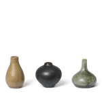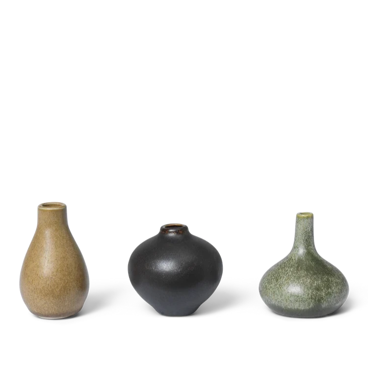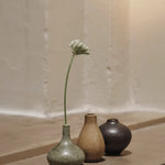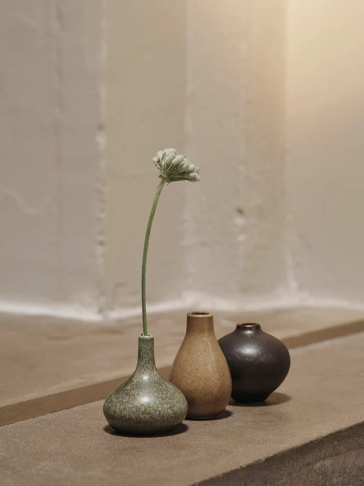 Extending the Komo series of mini vases, this charming trio features subtly rounded, chubby forms that exude warmth and whimsy. Position them on your favorite bookshelf alongside other cherished objects, on the table with single-stem flowers or place a tray underneath to use them for incense sticks.