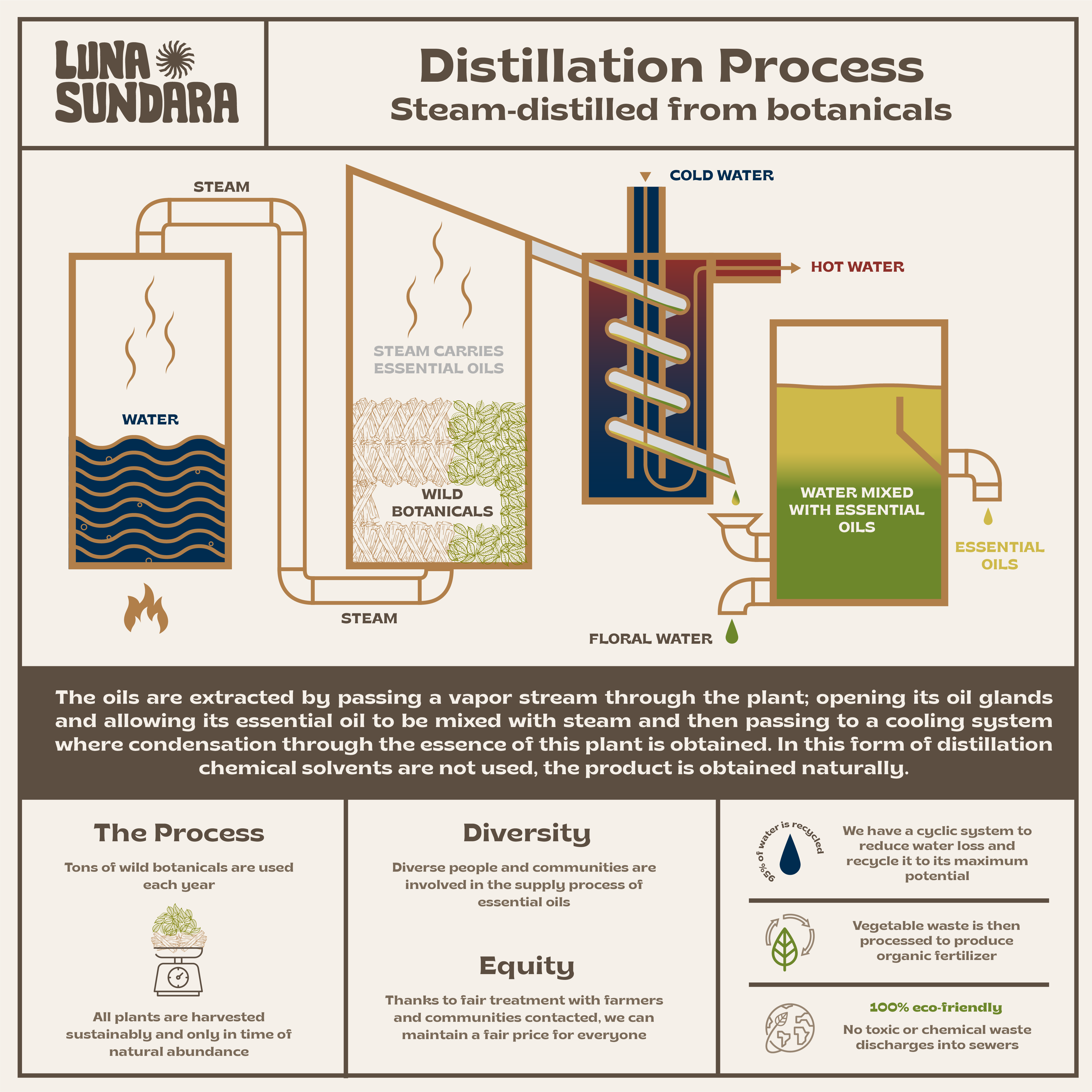 This essential oil extracted using a steam distillation process from sustainably sourced Ecuadorian Palo Santo. No solvents are used and water and organic matter produced during the process is recycled or turned into fertilizer.