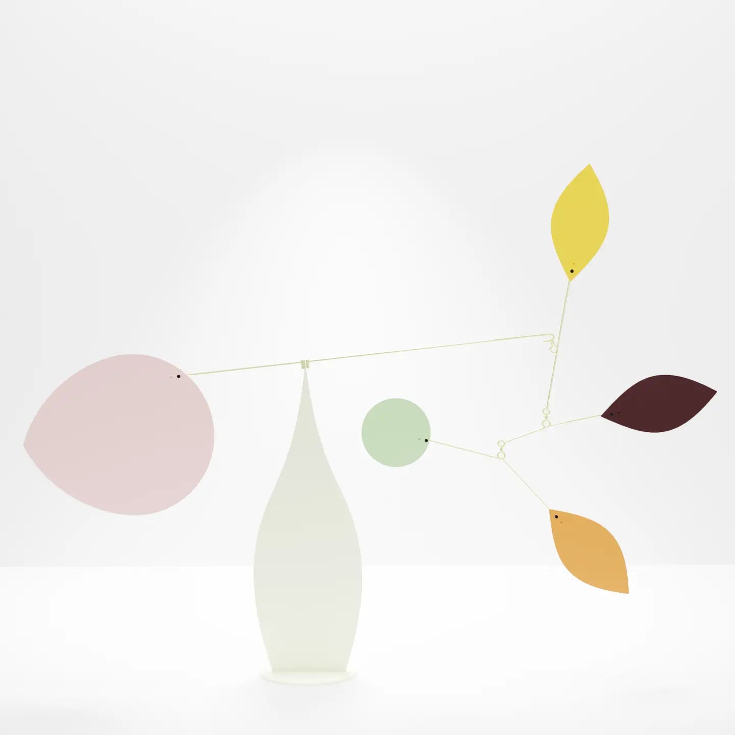 The Malaga mobile is bright and airy, featuring leaf-like shapes swaying around a cream colored base. Volta mobiles evoke both strength and fluidity, with delicate blades suspended from slim, hand-bent steel rods balanced perfectly on a solid base.
