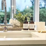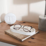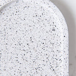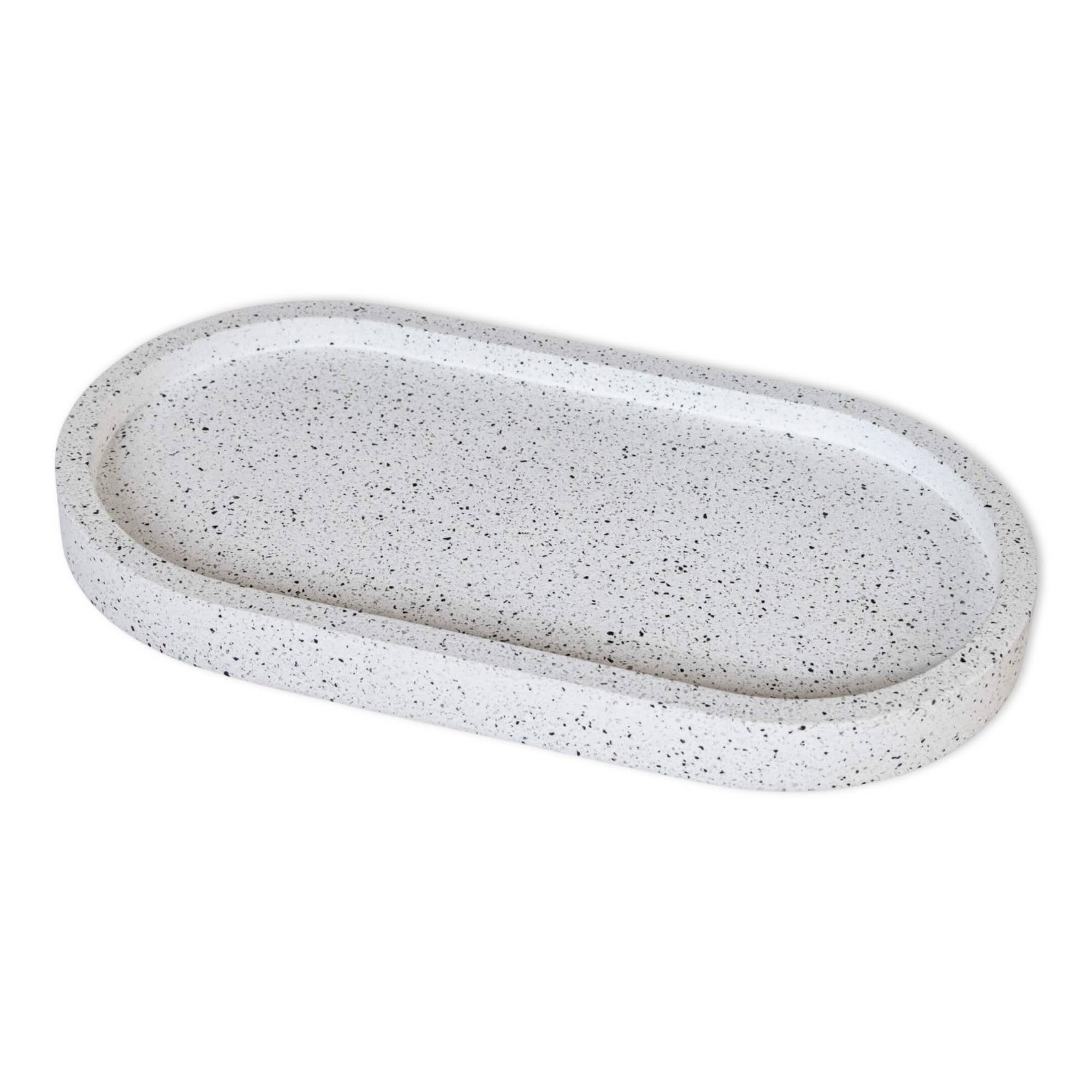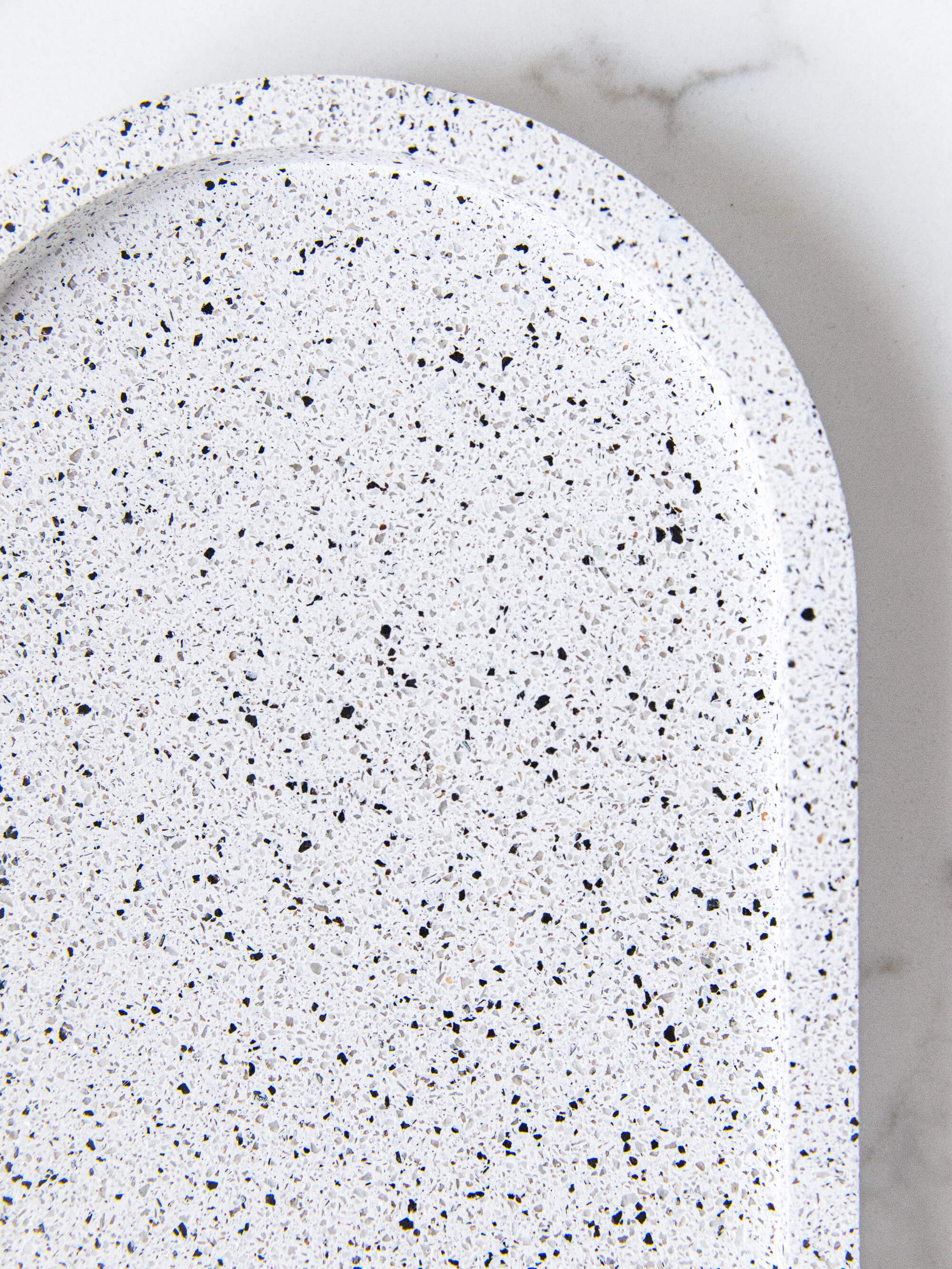 This flat oval tray with slightly raised edges is a minimalist home for all your wares. In white granite terrazzo, the tray has a textured surface with small black and grey speckles and subtle shimmery particles.
