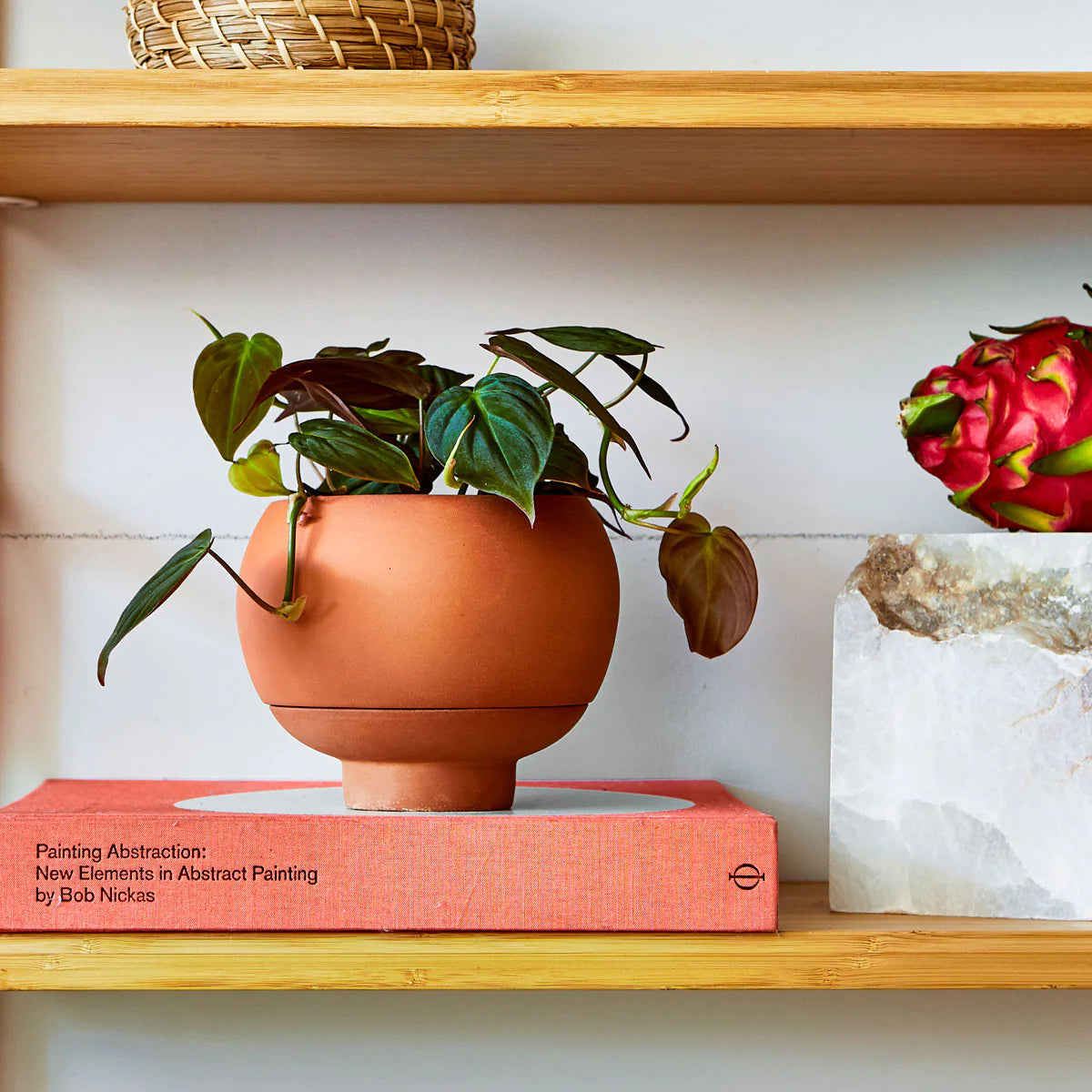 Sunny shelf near window with vases, planters, and other objects