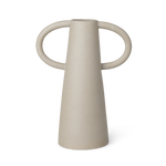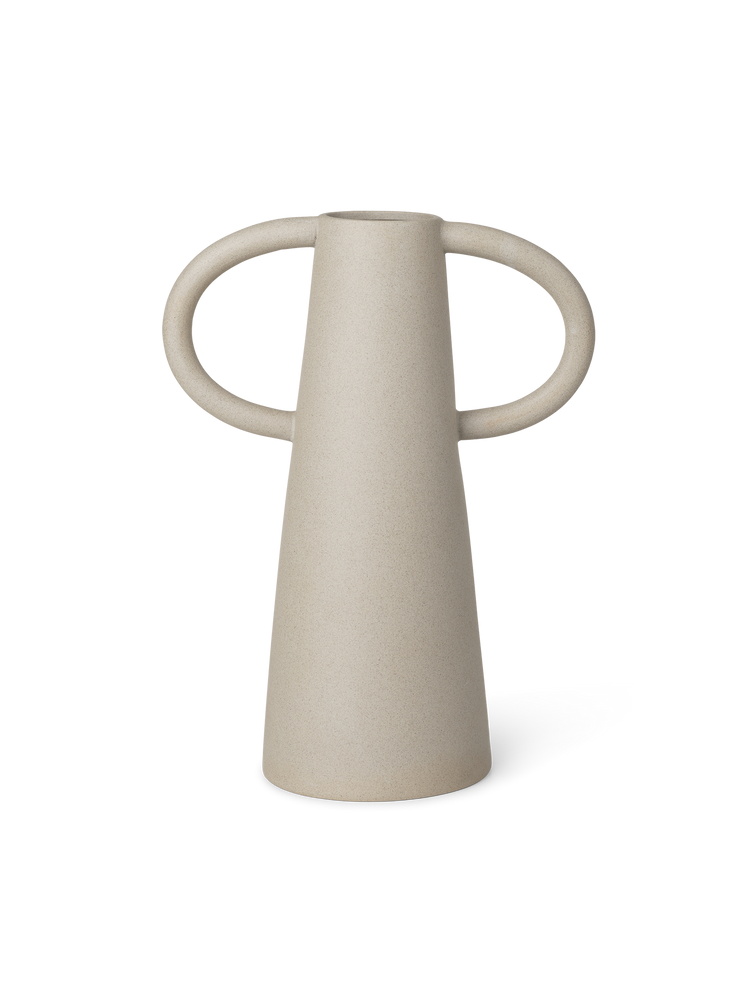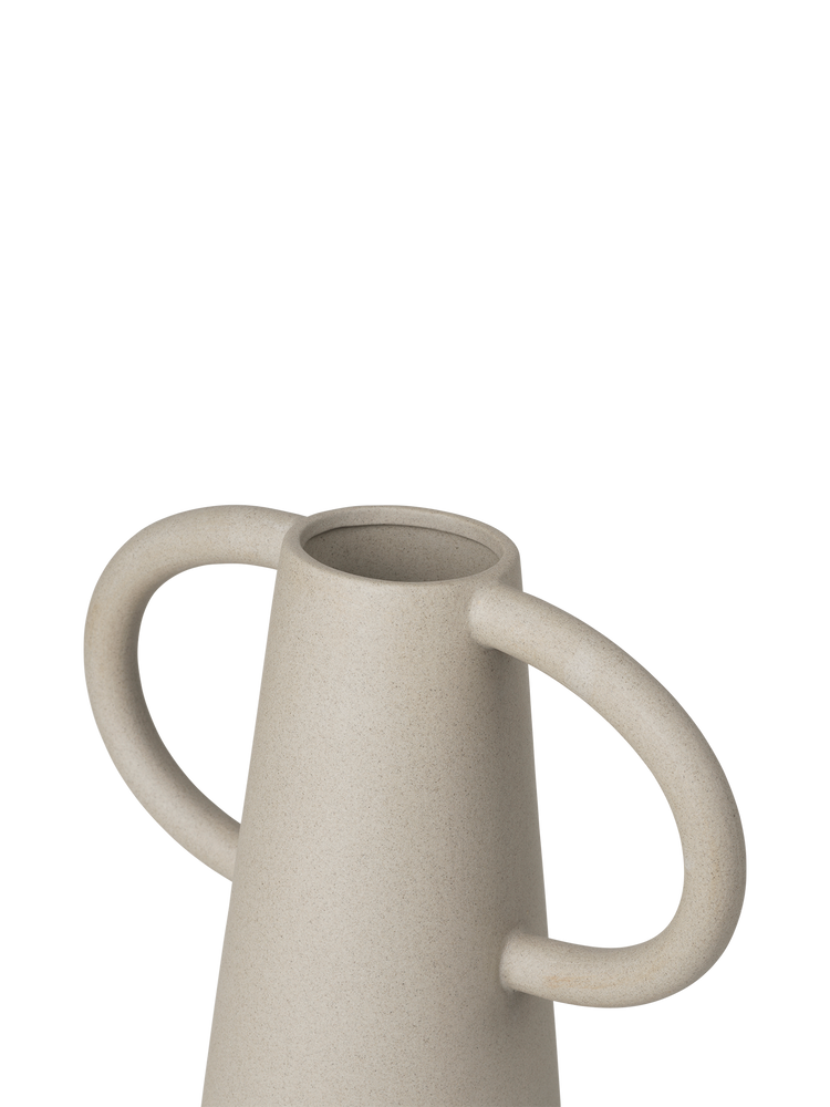 Past and present fuse together in the Anse Vase. Made from a special, rustic clay, the vase’s raw sand colour and rough texture is pleasantly contrasted by its clean, conical shape. A set of hand-formed handles recalling traditional pottery provides a subtle contrast.