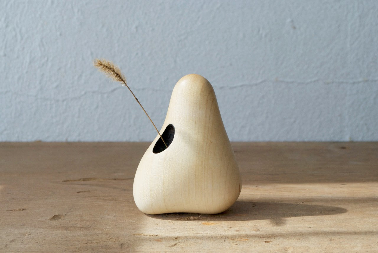 Carved from maple, this work of art also functions as a vase, with a darkened hollow ready to display dried stems or anything else you want to spotlight. The possibilities for ikebana with this little ghost could be quite interesting.