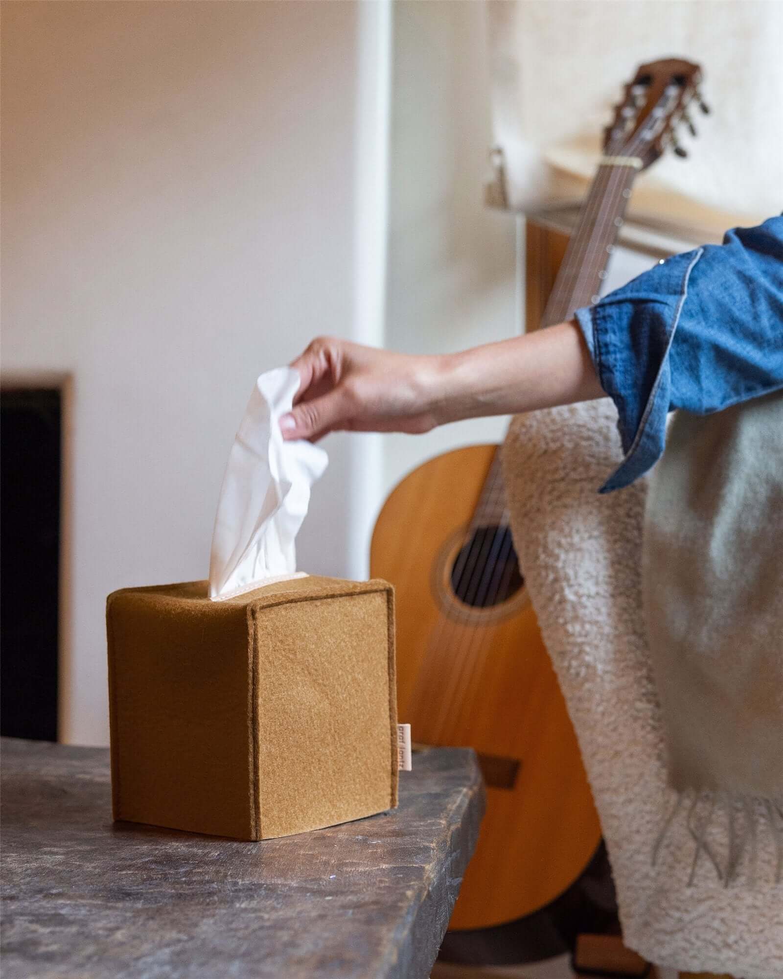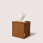 A stylish tissue box cover for the stylish home. Cover up branded tissue boxes with a simple and minimal felt sleeve for that last finishing touch in your home. Leather trimmed tissue opening.