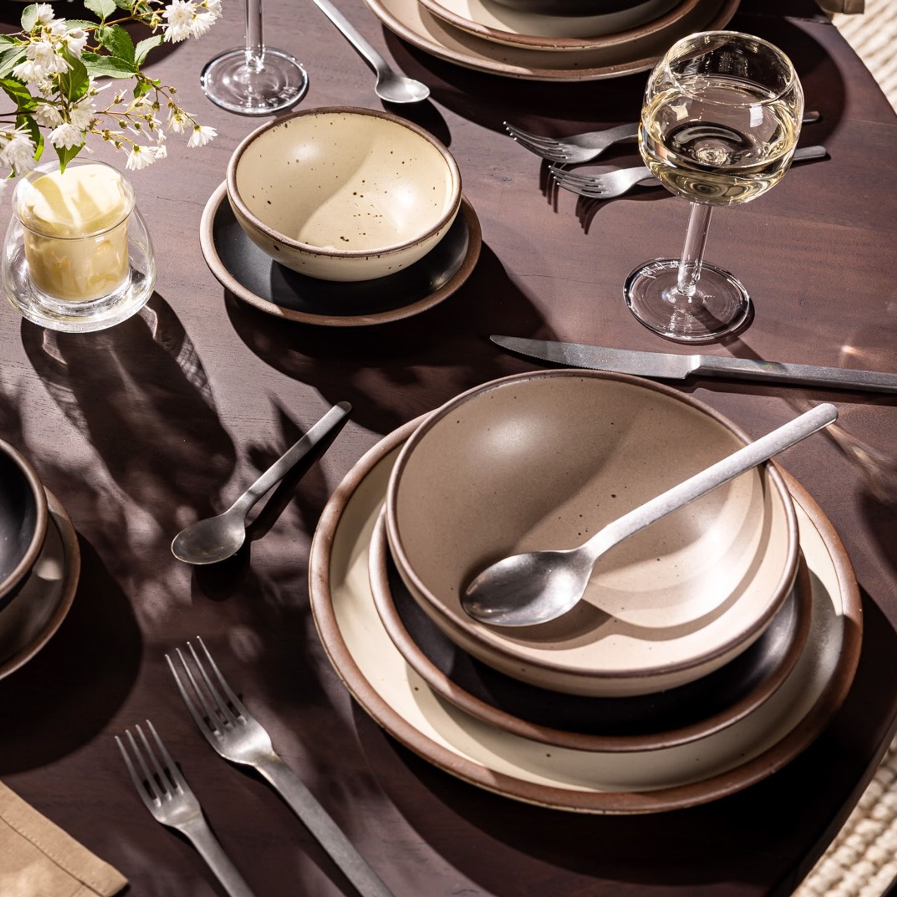 East Fork pottery is made from a blend of iron-rich stoneware clay and minerals. Through their firing process, iron molecules are drawn to the surface of the clay, resulting in beautiful glazes with a distinctive brown speckled surface that East Fork is known for.