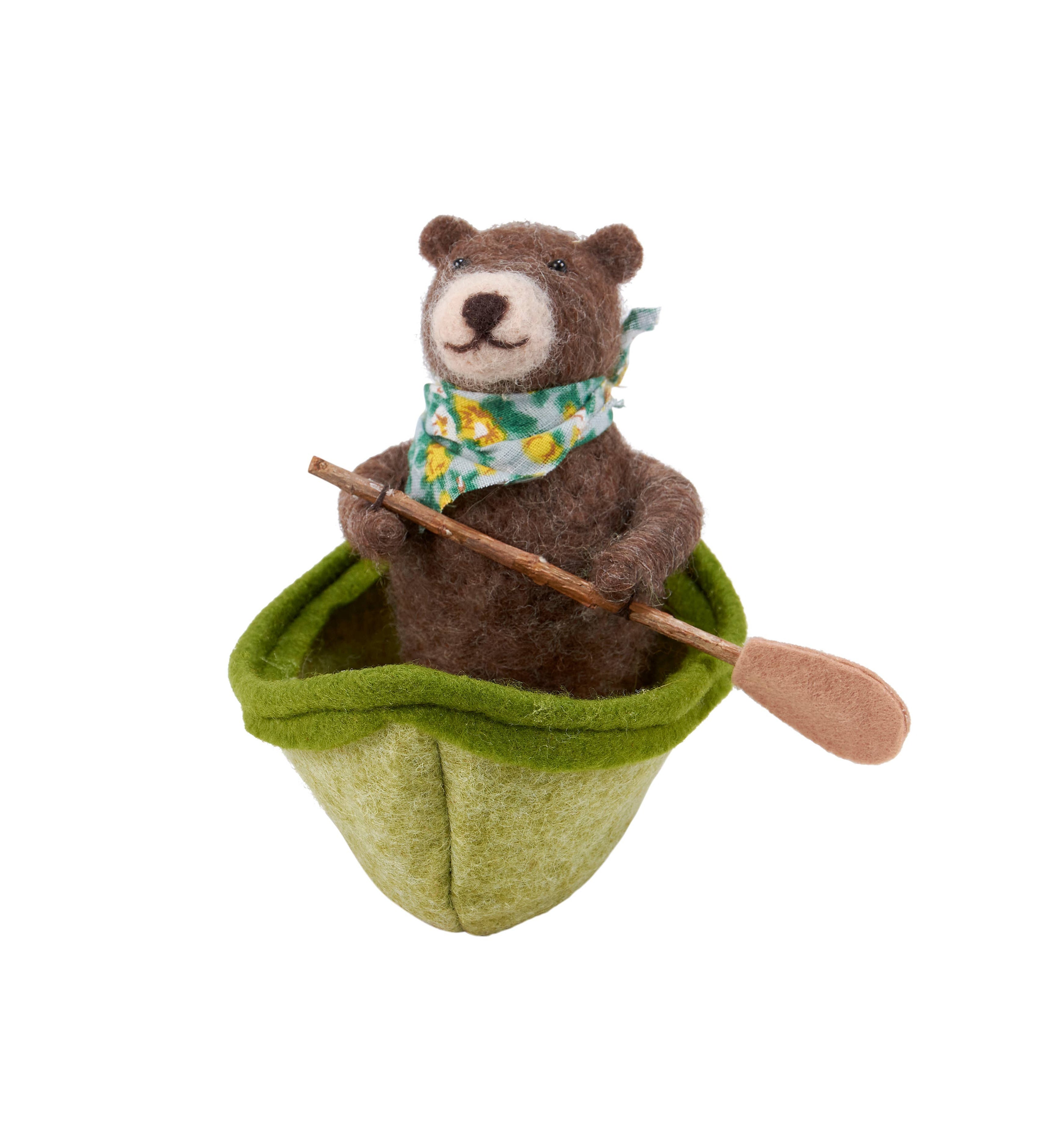 A woodland bear paddling in a green rowboat sports a jaunty bandana. Designed to free-stand on flat surface for display.