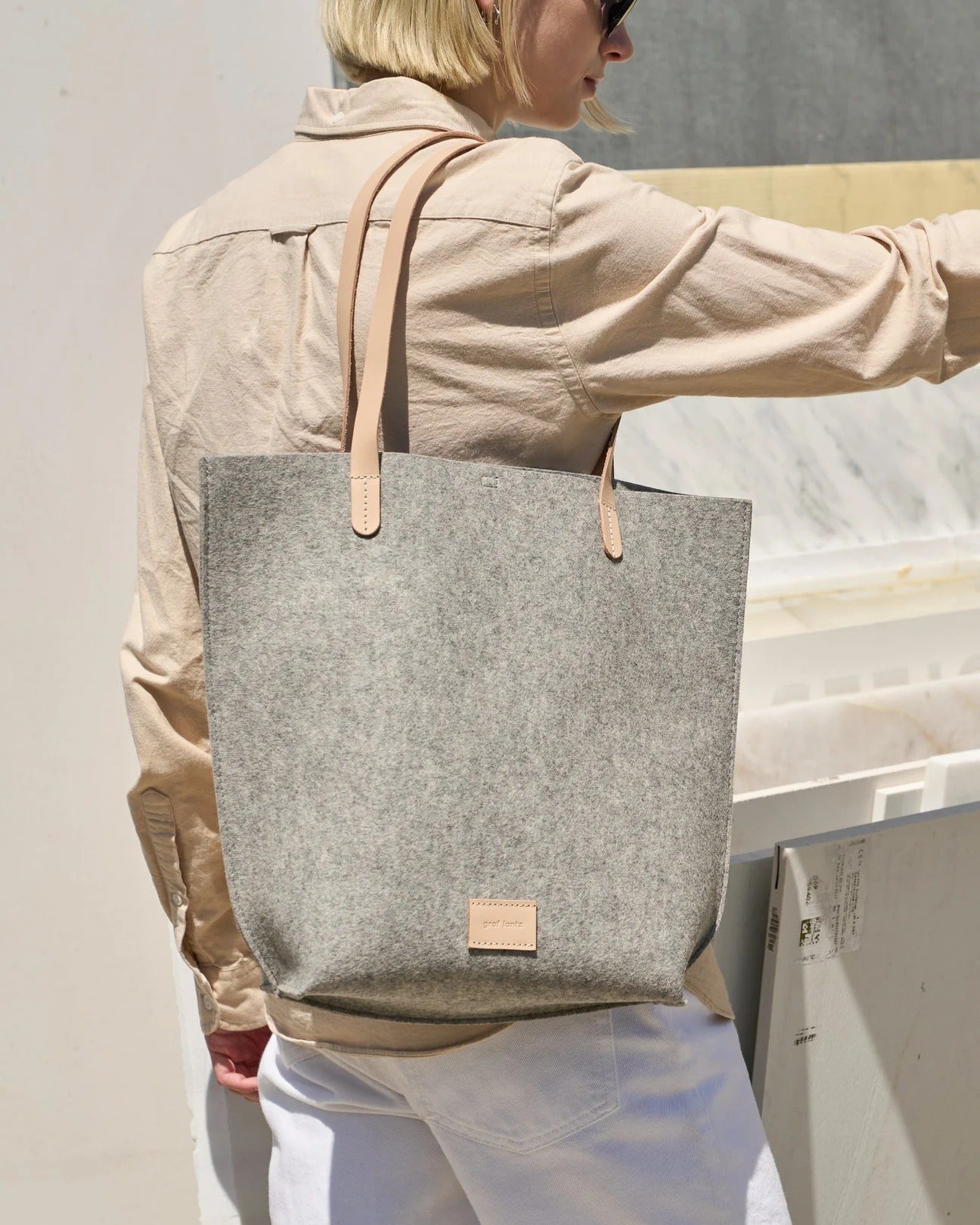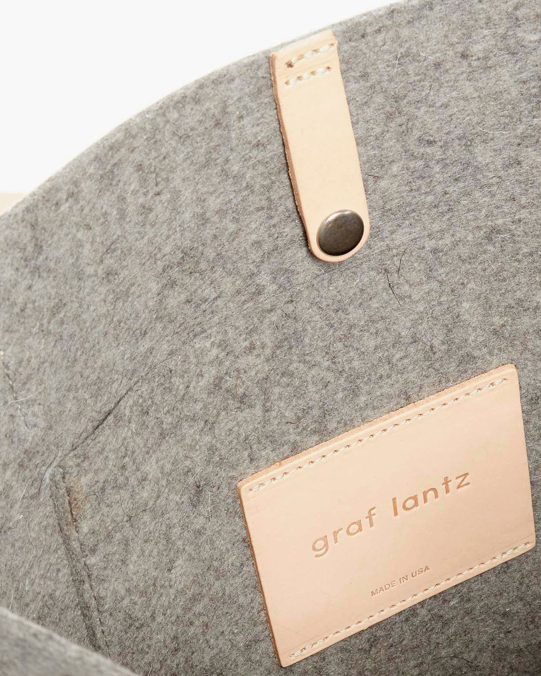 The ultra-light Hana Tote is handmade with stain, water and odor-resistant premium Merino wool felt in Graf Lantz's Los Angeles factory and features an interior patch pocket, snap closure and vegetable-tanned leather straps.