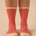 Lightweight, comfy crews socks with classic off-white stripes on red and Hooray's signature color bars.