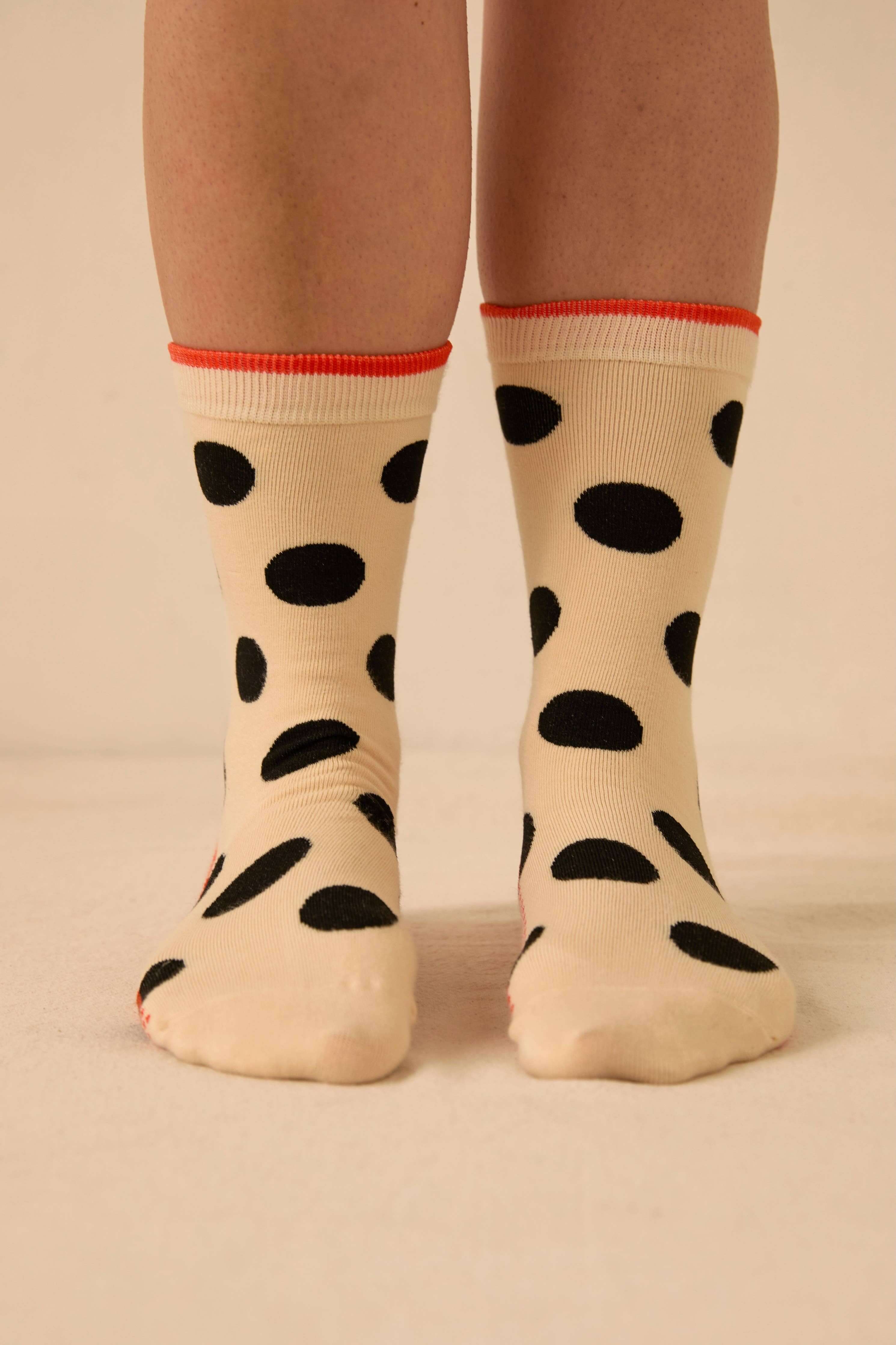Lightweight cotton crew length socks feature large black polka dots on an off-white base.  Bright orange accents complete the fun!