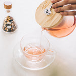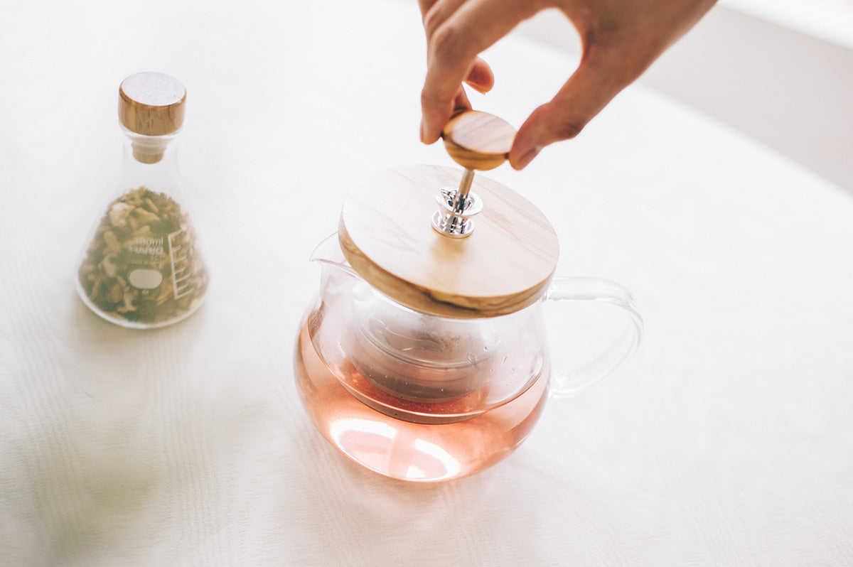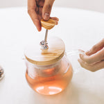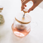 Glass teapot with wooden lid on a white surface, with a hand holding the tea strainer handle
