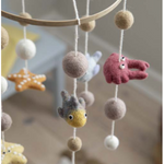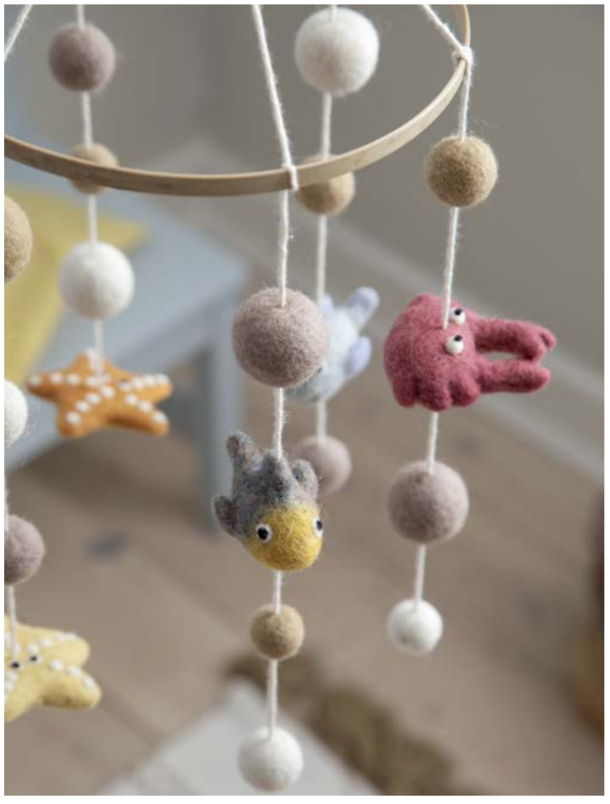 Adorable sea creatures float among felted wool balls in gentle muted colors. Designed in Denmark by Gry & Sif, a fair trade company, and made by skilled Nepalese artisans.