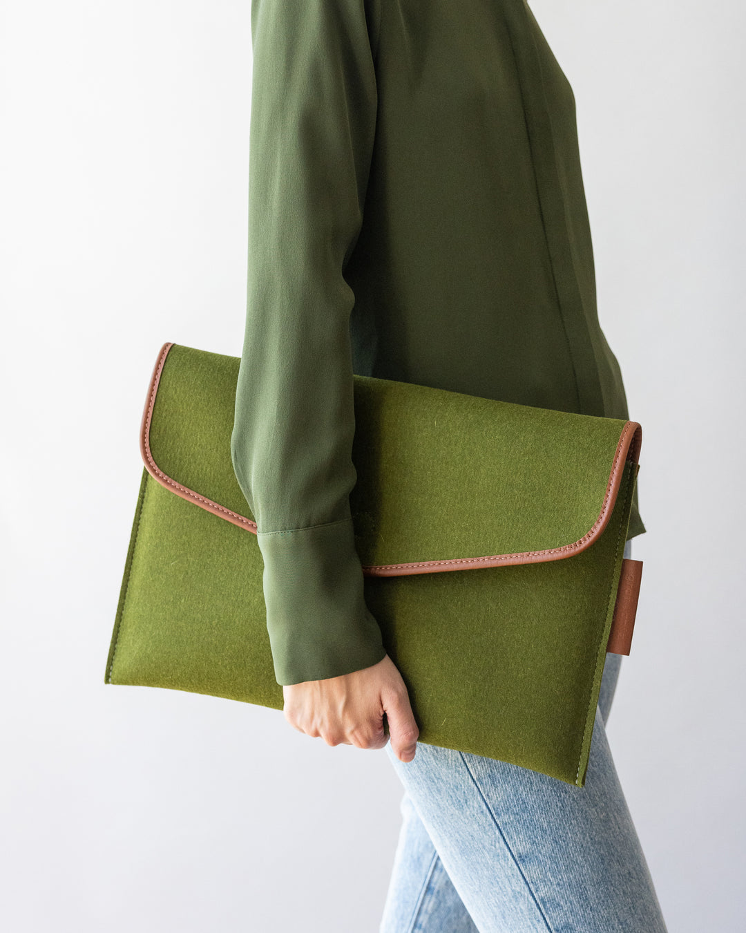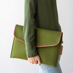Hearkening to the elegant folios of the past, the large envelope clutch has been reimagined as a stylish laptop sleeve. The plush and vibrant merino wool protects your tech and accessories from damage and scratches, while the vintage-inspired leather edge binding gives structure and elegance.