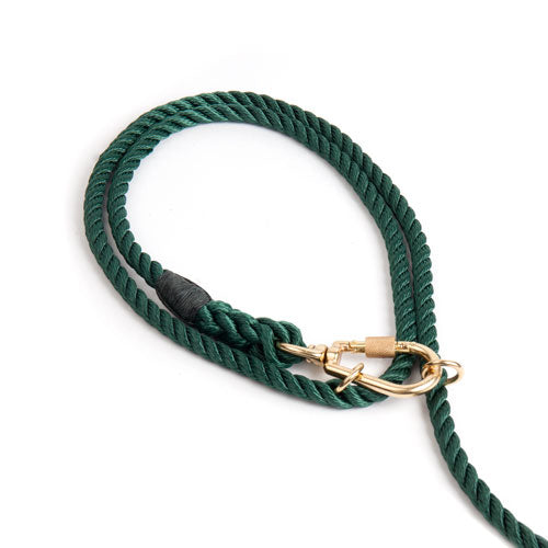 Hunter green Adjustable Rope Leash is coiled in a circle, with each end ending in a carabiner style brass clip that rests on top of the coil.