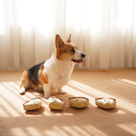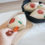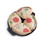 The DEEP DISH PIZZA dog toy from Lambwolf Collective is a life-size snuffle and burrowing toy in one. Each pizza slice squeaks and has two pockets in them (a total of 8 snuffle pockets in the whole pizza), and can be used as a snuffle mat when assembled together. The pizza dish is crinkly and makes for a perfect burrow toy as well! Also excellent for sharing as well ;)