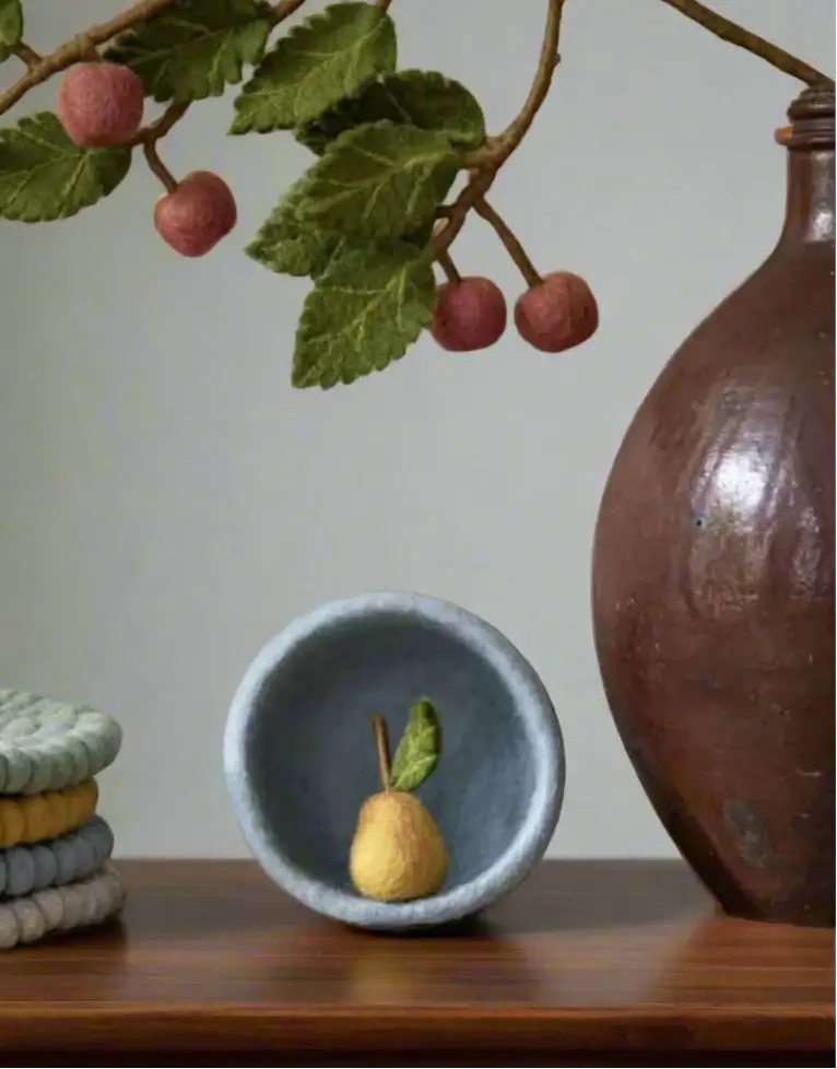 Handmade felt pear ornament and bird on branches, perfect for cozy, sustainable decor in Easter tablescapes.