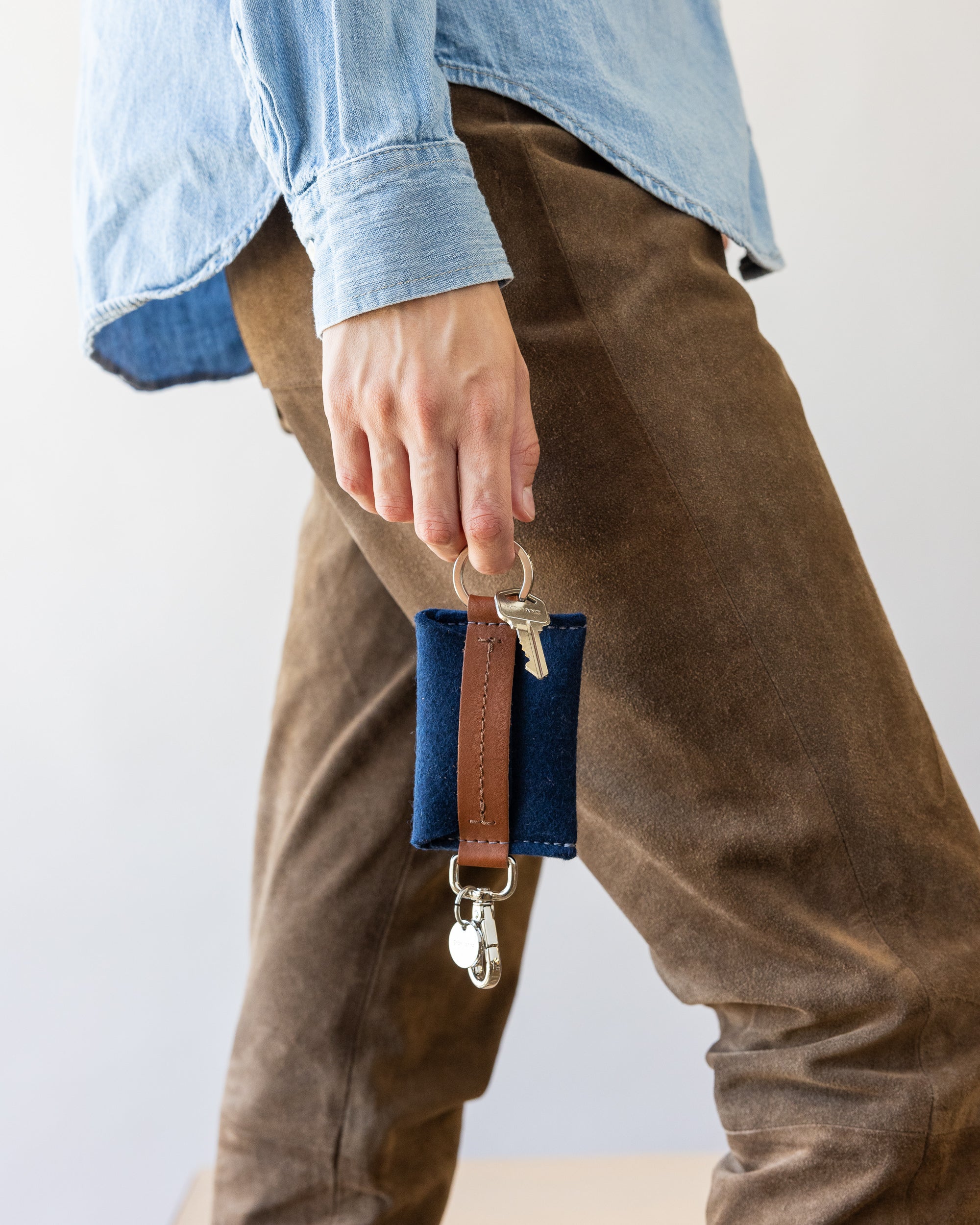 Walking woman holds Marine-colored Merino Wool Card Key Fob on one finger beside her leg in brown pants, white background.