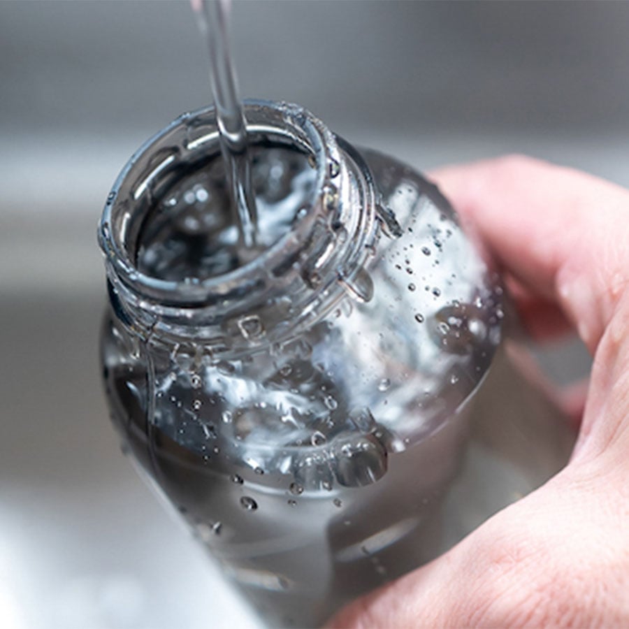 A lightweight and compact water bottle that's easy to carry around. The beautiful form, transparency, and grey color of the bottle is accentuated when the bottle is filled with water.