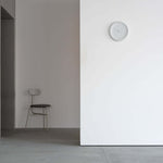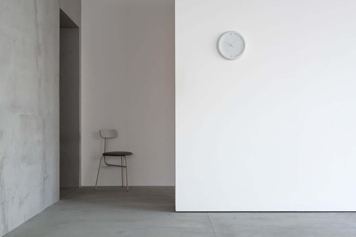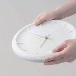 Featuring a gentle concave surface and a softly rounded frame, the 12 raised lines and slim hour and minute hands create delicate shadows across the face of the clock. These features in relief also showcase the texture of the material.