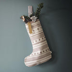 A modern Christmas stocking for the modern home. Patterned with decorative lines and dots, this festive Christmas stocking is generously sized to hold treats and goodies. Comes with small hanging loop.